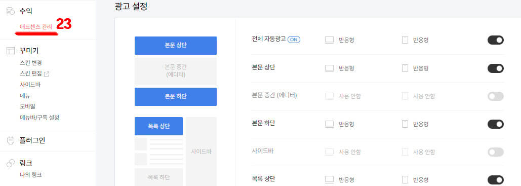 위에 페이지와 같이 원하시는 방향으로 광고 설정을 해주시면 바로 블로그에 광고 송출되는 것을 확인하실 수 있어요.